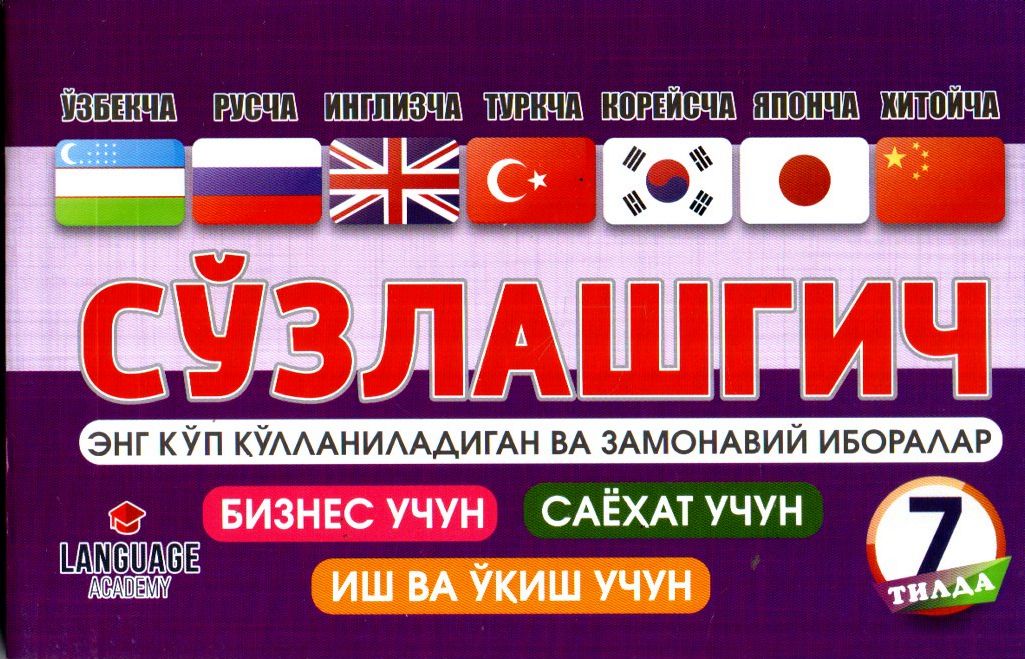 Ўзбекча-русча-инглизча-туркча-корейсча-японча-хитойча сўзлашгич. Энг кўп қўлланиладиган ва замонавий иборалар. Бизнес учун, саёҳат учун, иш ва ўқиш у..